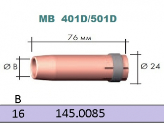 Газове сопло, конічне D 16,0мм довжина 76,0 мм для зварювальних пальників з рідинним оходлдженням MB 401D, МВ501D GRIP.