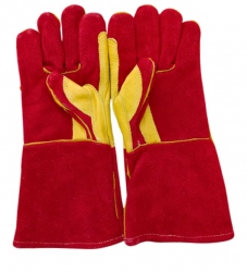 Краги зварювальника червоні посилені, виготовлені з натурального матеріалу - спілок та мають бавовняну підкладку. Розмір - 10 (ширина долоні 13см). Зносостійкість (0-4) - 4. Стійкість до порізів (0-5) - 1. Стійкість до розриву (0-4) - 4. Стійкість до спалахування (0-4) - 4. Стійкість до контактного тепла (0-4) - 1. Стійкість до конвективного тепла (0-4) - 3. Стійкість до бризок розплавленого металу (0-4) - 4.